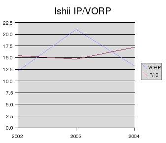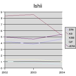 Ishii's fall from whatever grace he had merely put an exclamation point on what appears to be a fizzling career in the U.S. majors. That he is still with the Dodgers is testament to either (a) the fact that DePodesta is not the miracle worker Billy Beane is, or (b) that not even Beane could move Terrence Long before he became a free agent this year. Some players are simply untradeable, and if there was a moment to trade Ishii, it's long past. His declining K/9 rate in conjunction with his usual second-half meltdown caused Dodger fans long ago to vote him off Mound Island. The paranoid might be tempted to speculate that Norihiro Nakamura was acquired, not so much as a realistic option at third, as somebody to keep Kaz from getting lonely.