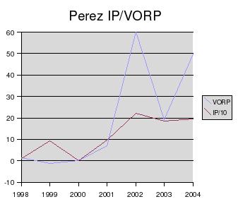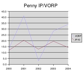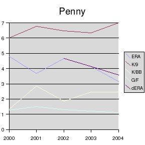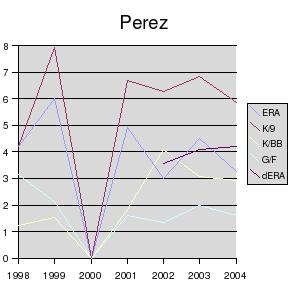 Find a penny, pick it up... a one-year, $5.1M contract that will scare the bejesus out of Dodger fans everywhere. Okay, I'm being melodramatic; it's only one year, and it's really not for that much. (For a definition of "too much", see Lowe.) Penny's nerve damage in his arm is so unusual that Frank Jobe claims to have never seen anything like it before, which says nothing about its likelihood of recurrance. Without that we have comparables -- the big key to finding out how confident PECOTA is in its projection -- we don't know how good this projection is, but the low number of innings pitched tells us PECOTA thinks he's a solid bet to return to the DL. On the other hand, if he makes it to, say, 160-180 IP, he'd be worth 21.7 VORP. The upside is a guy who can get the job done when healthy, but isn't necessarily going to be healthy for you. Four wins is probably the upper limit for Brad, and I'm skeptical of calling him the likely team ace this year. Still, with stable and increasing strikeout rates and solid control, he's one of the top bets for that mantle -- along with our next subject, Odalis Perez.