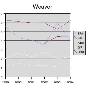 Is PECOTA being conservative because of his injury year in 2000? With increasing dERA (but too little data to accurately assess it), and gradually declining strikeout and K/BB rates, OP nonetheless is still a fine pitcher. I wouldn't go so far as to call him a guy to build around; his 2004 postseason meltdowns were proof enough of that. But, he's a solid 2-3 guy in the presence of a real mound menace -- something the Dodgers decidedly lack this year.
