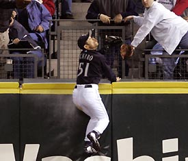 Update: Of course, the one thing I forget to mention is perhaps the highlight of the evening. Even though Ichiro couldn't buy a hit off the Angels, he robbed Garret Anderson of a home run on an incredible catch. If you missed it, it's a highlight reel for the year. And, hey, WTF is up with that idiot fan trying to snag the ball to Ichiro's right?