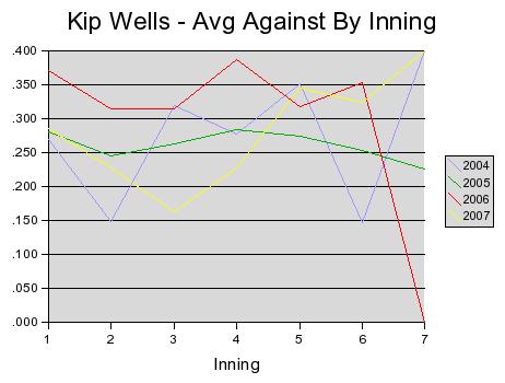 Offense: Heavenly. Not so much the first few innings, but the broadcast team mentioned that Kip Wells is good through the first three, and terrible thereafter. It's a pattern that's really developed in the last couple of years: